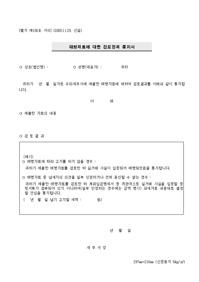 9,000원/월귀하가 0000년 00월 00일자로 세무서에 제출한 해명자료에 대하여 검토결과를 통지하는 제100호 해명자료에 대한 검토결과통지서 (2000.11.29. 신설) 양식입니다.