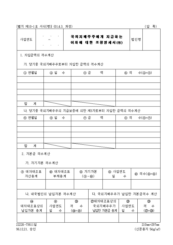 9,000원/월차입금액의 적수계산,자본금 적수계산을 기록하는 제10-1호(병) 국외지배주주에게지급하는이자에대한조정명세서(병)입니다. (2001.4.3. 개정)