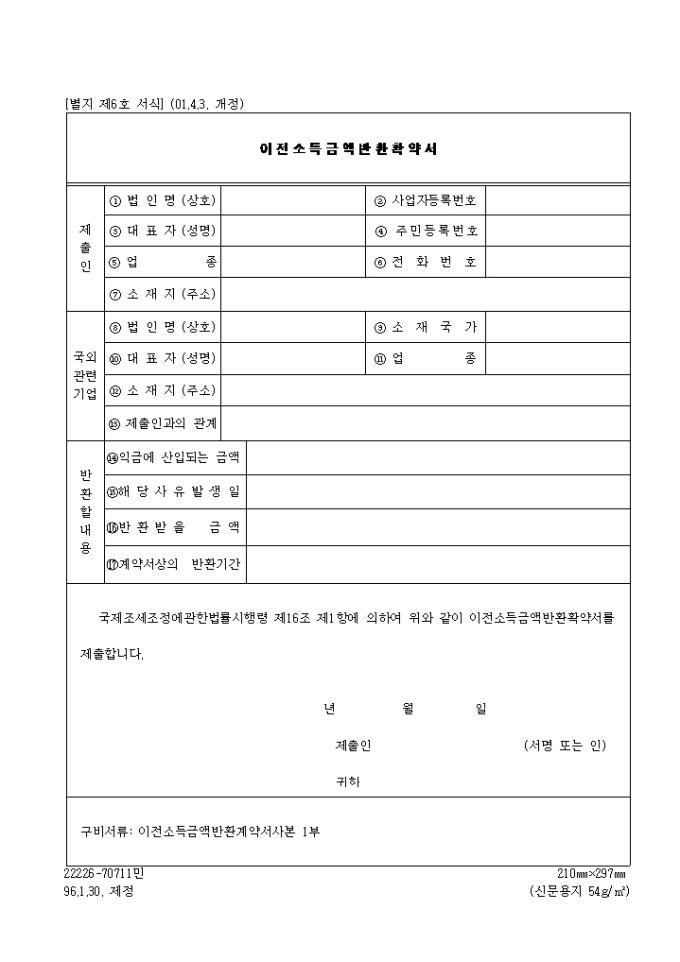 9,000원/월국제조세조정에관한법률시행령 제16조 제1항에 의한 제6호 이전소득금액반환확약서입니다.(2001.4.3. 개정)