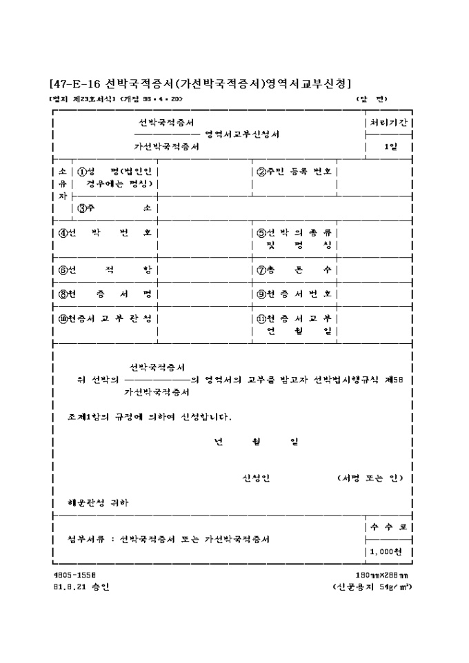 9,000원/월위 선박의 (선박국적증서, 가선박국적증서)의 영역서의 교부를 받고자 선박법시행규칙 제56조제1항의 규정에 의하여 신청하고자 할 때 사용하는 '(선박 국적증서, 가선박 국적증서) 영역서 교부신청서' 양식입니다.