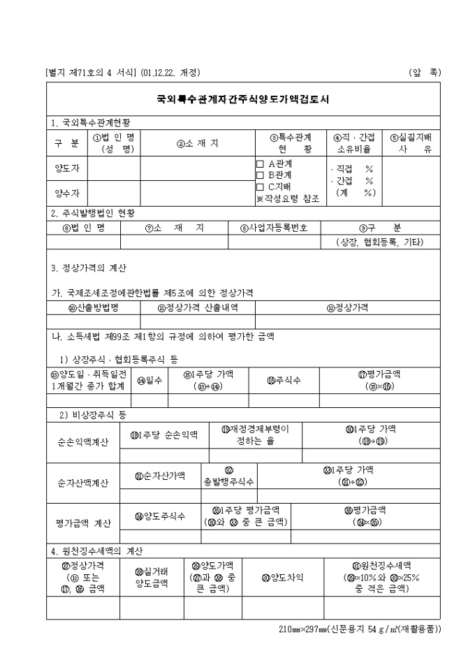 9,000원/월제71호의4 국외특수관계자간주식양도가액검토서로 국외특수고나계현황,주식발행법인 현황,정상가격의 계산,원천징수세액의계산을 기록합니다. (2001.12.22. 개정)
