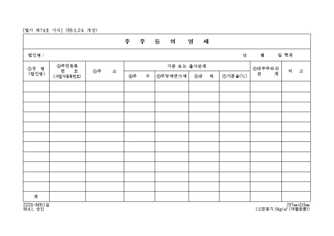 9,000원/월제74호 주주등의명세표로 성명,주민등록번호,주소,지분 또는 출자관계,대주주와의 관계를 기록합니다. (1999.5.24. 개정)