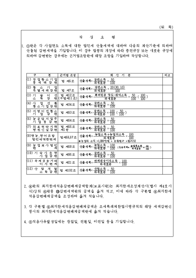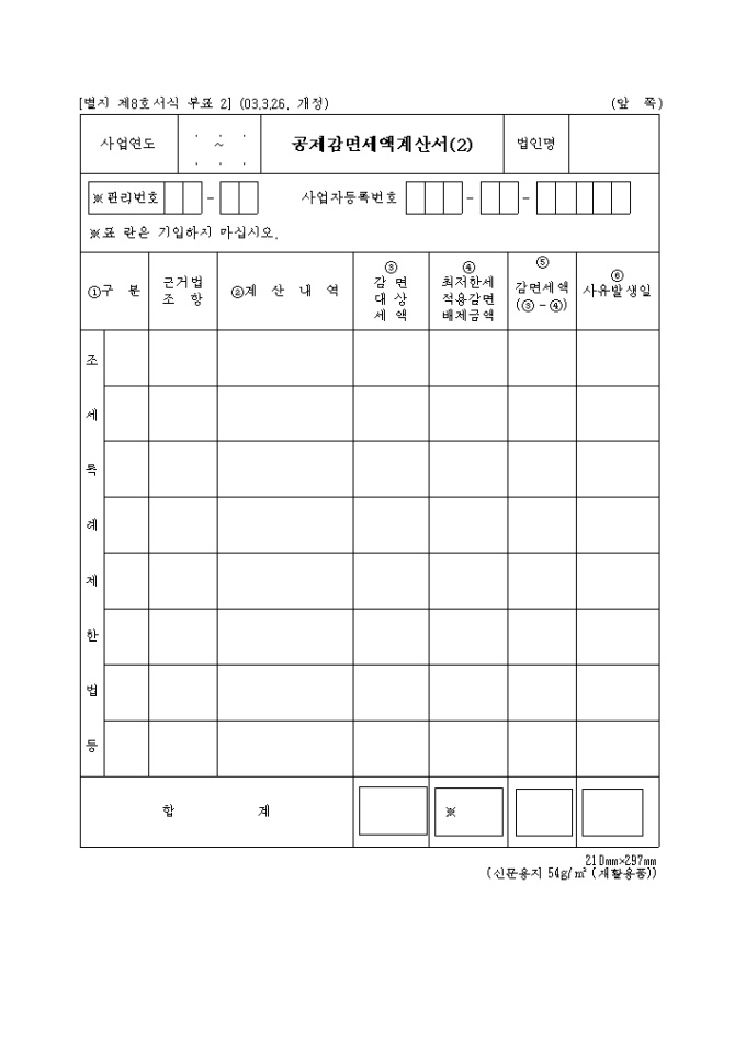 9,000원/월제8호부표2 공제감면세액계산서(2)로 구분,근거법조항,계산내역,감면대상세액,최저한세적용감면 배제금액,감면세액,사유발생일을 기록합니다. (2003.3.26. 개정)