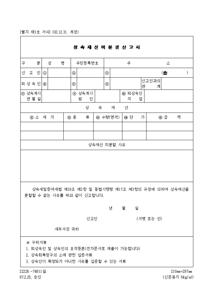 9,000원/월상속세및증여세법 제19조 제2항 및 동법시행령 제17조 제3항의 규정에 의한 제3호 상속재산미분할신고서입니다. (2002.12.31. 개정)