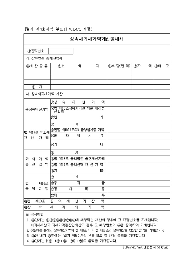 9,000원/월상속받은 총재산명세,상속받은 총재산명세 내역을 기록하는 제9호부표1 상속세과세가액계산명세서입니다. (2001.4.3. 개정)