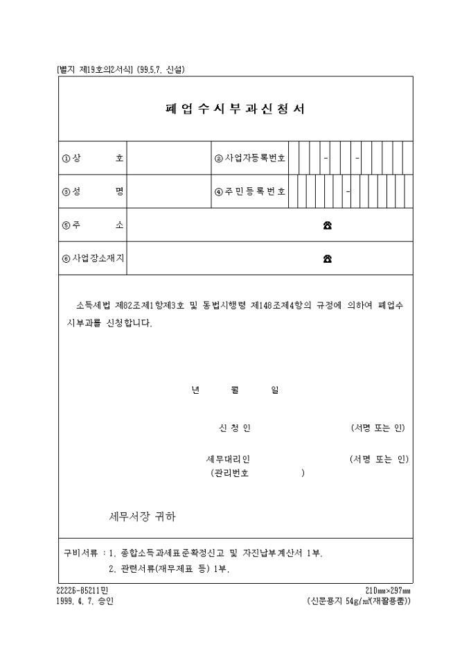 9,000원/월소득세법 제82조제1항제3호 및 동법시행령 제148조제4항의 규정에 의하여 폐업수시부과를 신청할때 사용하는 양식입니다.