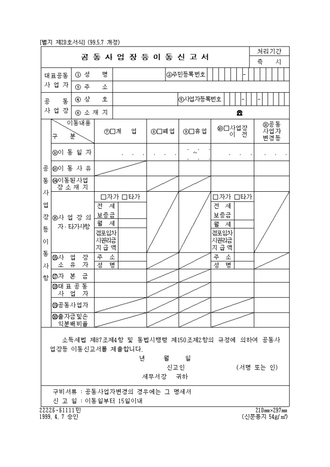 9,000원/월소득세법 제87조제4항 및 동법시행령 제150조제2항의 규정에 의하여 공동사업장등 이동신고를 할때 사용하는 양식입니다.