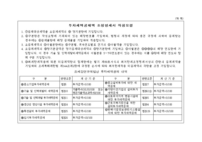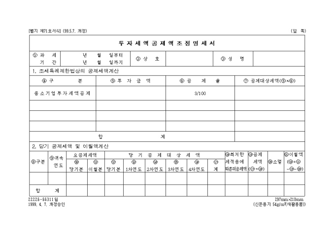 9,000원/월별지 제71호 투자세액공제액조정명세서로 조세특례제한법상의 공제세액계산,당기 공제세액 및 이월액계산을 기록하는 양식입니다. (1999.5.7. 개정)