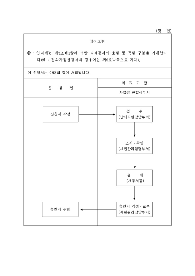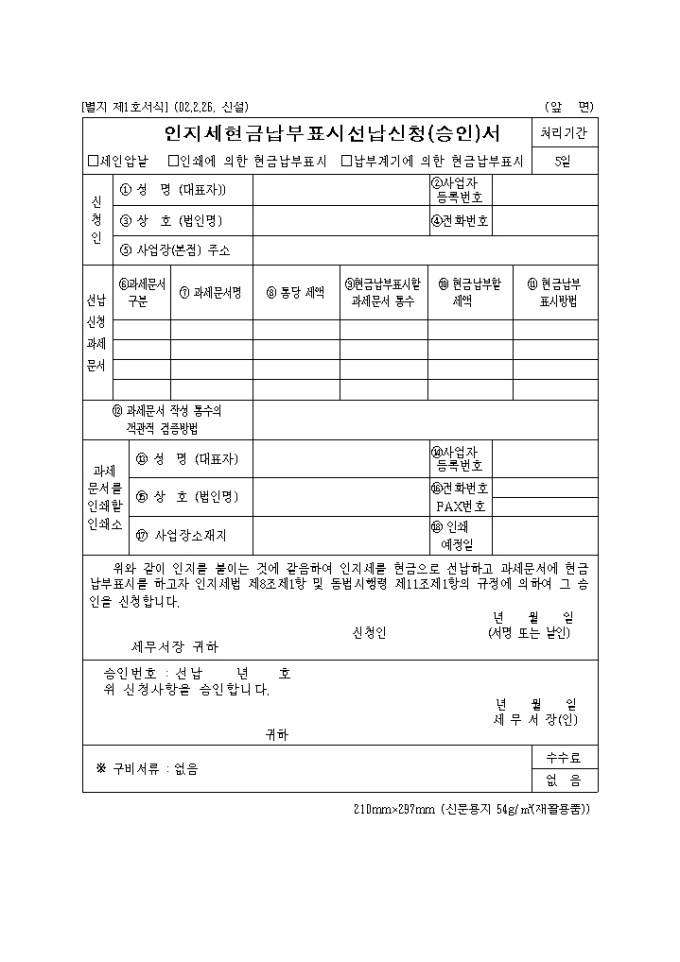 인지세법 제8조제1항 및 동법시행령 제11조제1항의 규정에 의한 제1호 인지세현금납부표시선납신청(승인)서입니다. (2002.2.26. 신설)