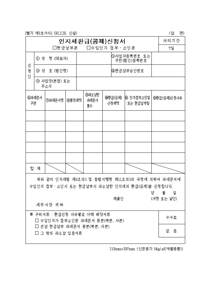 9,000원/월인지세법 제8조의3 및 동법시행령 제11조의3의 규정에 의한 별지 제3호 인지세환급(공제)신청서로 신청인 인적사항,환급내역을 기록합니다. (2002.2.26. 신설)