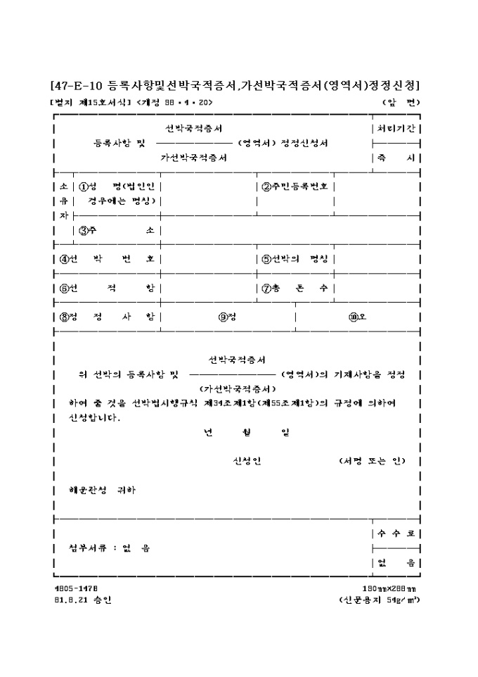 9,000원/월위 선박의 등록사항 및 (선박국적증서,가선박국적증서)(영역서)의 기재사항을 정정 하여 줄 것을 선박법시행규칙 제34조제1항(제55조제1항)의 규정에 의하여 신청하고자 할 때 사용하는 '등록사항 및 (선박국적증서,가선박국적증서) (영역서)정정신청서' 양식입니다.