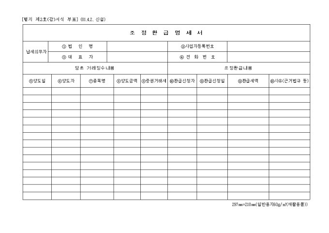 납세의무자 인적사항,당초 거래징수내용,조정환급내용을 기록하는 제2호(갑)부표 조정환급명세서입니다. (2001.4.2. 신설)