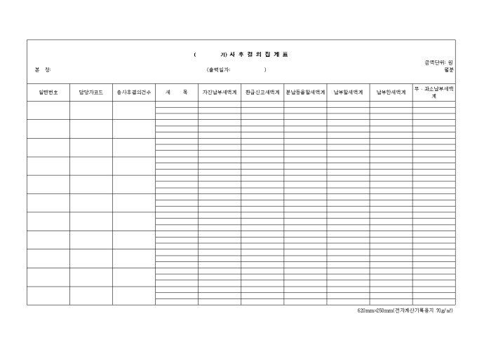 9,000원/월제40호 사후 결의 집계표 양식입니다. 지방청, 총사후결의 건수, 납부할 세액계, 환급할 세애계, 납부한 세액계, 무.과소 납부세액계 등을 기재합니다.