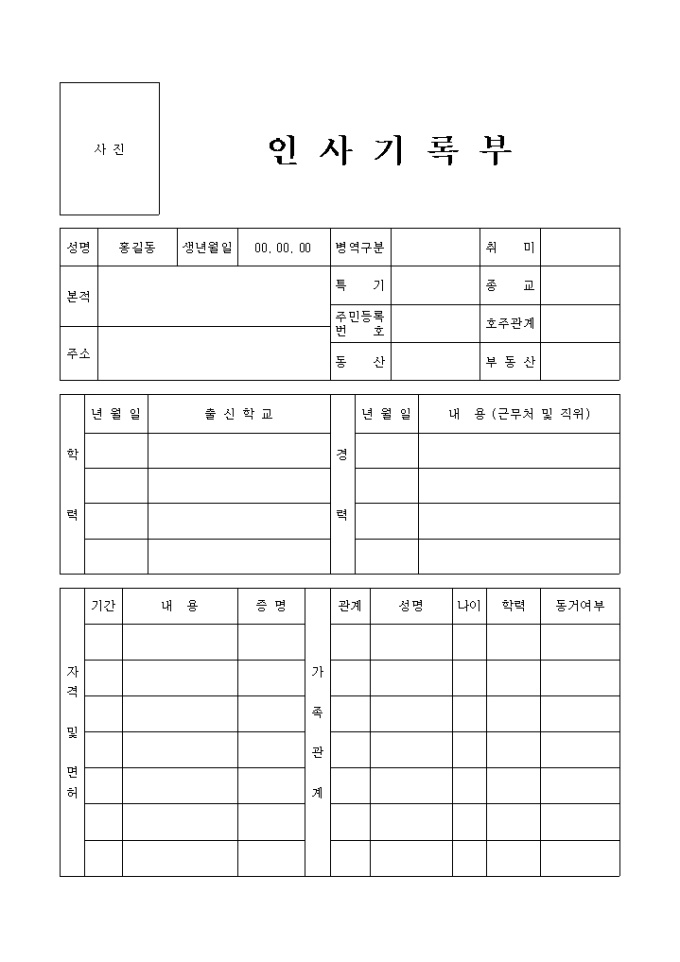 9,000원/월학력, 경력, 자격 및 면허, 가족관계를 기록하는 인사기록부입니다.