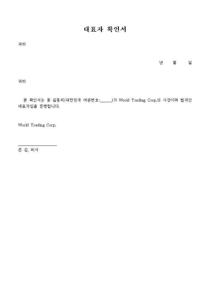9,000원/월해당 기업의 법적인 대표자 임을 증명하는 내용의 대표자 확인서 양식입니다.
