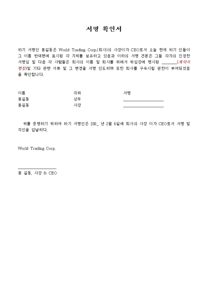 9,000원/월하기 서명인 홍길동은 World Trading Corp.(회사)의 사장이자 CEO로서 오늘 현재 하기 인들이 그 이름 반대편에 표시된 각 지위를 보유하고 있음과 이하의 서명 견본은 그들 각자의 진정한 서명임 및 다음 각 사람들은 회사의 이름 및 회사를 위해서 위임장에 명시된 ________(계약서 명칭)및 기타 관련 서류 및 그 변경을 서명 인도하며 또한 회사를 구속시킬 권한이 부여되었음을 확인하는 서명 확인서 양식입니다.