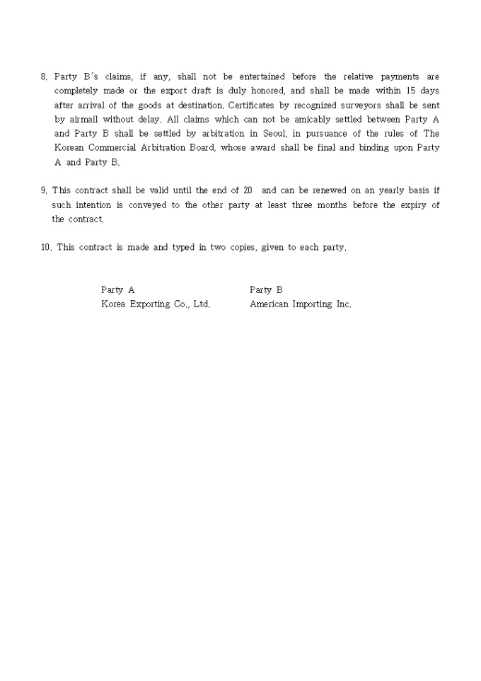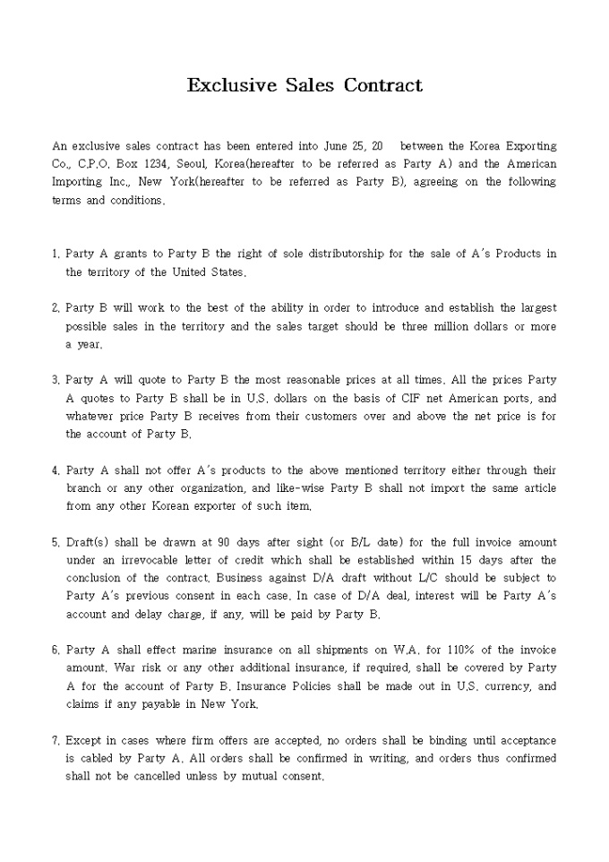 9,000원/월An exclusive sales contract has been entered into June 25, 20 between the Korea Exporting Co., C.P.O. Box 1234, Seoul, Korea(hereafter to be referred as Party A) and the American Importing Inc., New York(hereafter to be referred as Party B), agreeing on the following terms and conditions. Exclusive Sales Contract