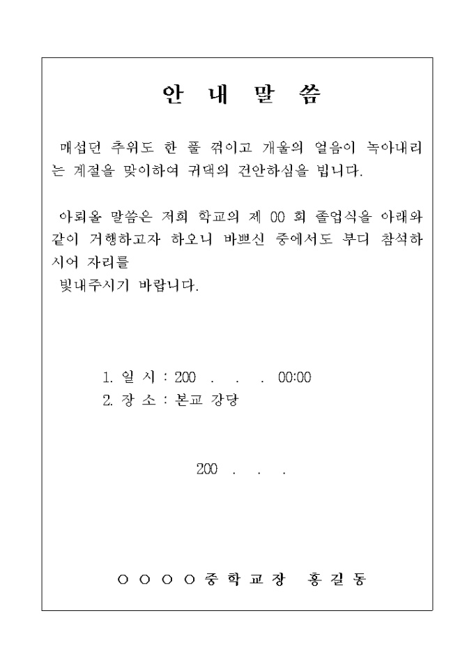 9,000원/월일시 및 장소와 함께 안내내용이 기재된 졸업식 안내장 양식입니다.