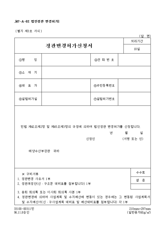 9,000원/월민법 제42조제2항 및 제45조제3항의 규정에 의하여 법인정관 변경허가를 신청하고자 할 때 사용하는 정관 변경 허가신청서 양식입니다.