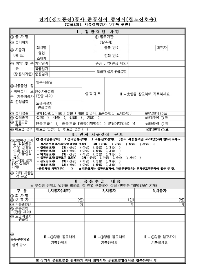 9,000원/월전기 공사 준공실적 증명서 양식입니다. 일반적인 사항, 전체 시공실적 규모, 공동수급 내용, 하도급 사항, 신청 및 확인 사항 등을 기재합니다. 실적 증명서 제출시 유의사항을 포함합니다.