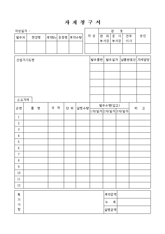 9,000원/월자재청구시 사용하는 양식으로 품명, 규격, 단위 실행수량, 발주수량등의 항목으로 구성되어 있습니다.