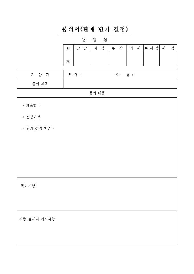 9,000원/월판매단가 결정 품의서를 작성할때 사용할 수 있는 문서입니다.