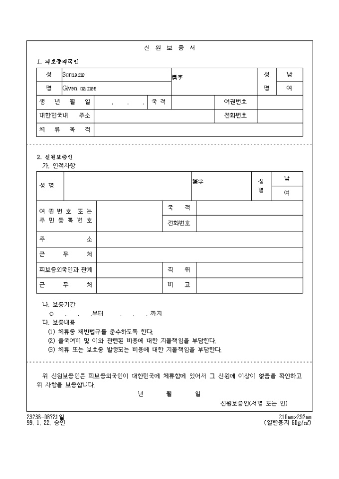 신원보증인은 피보증외국인이 대한 민국에 체류함에 있어서 그 신원에 이상이 없음을 확인하고 피보증외국인을 보증할때 사용하는 양식입니다.
