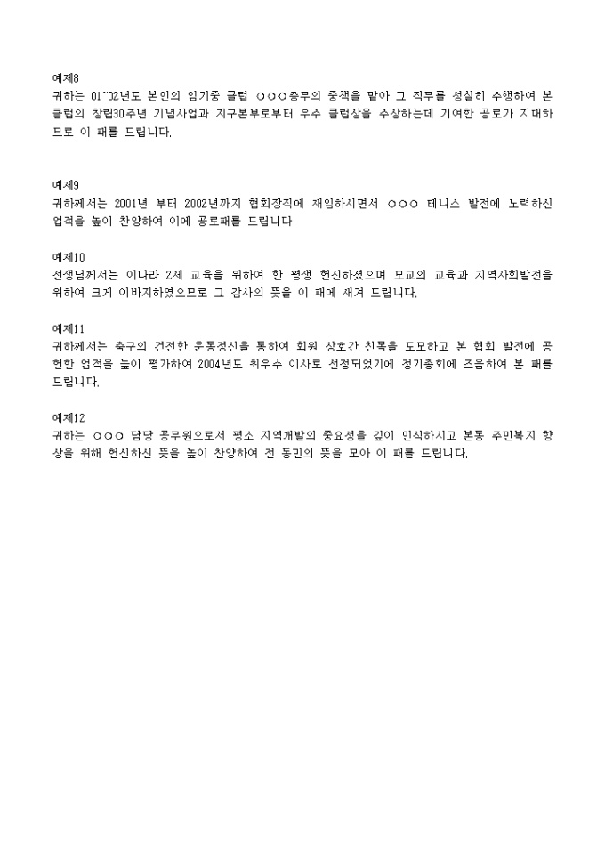 9,000원/월12가지의 예제가 있는 공로패 문구입니다.