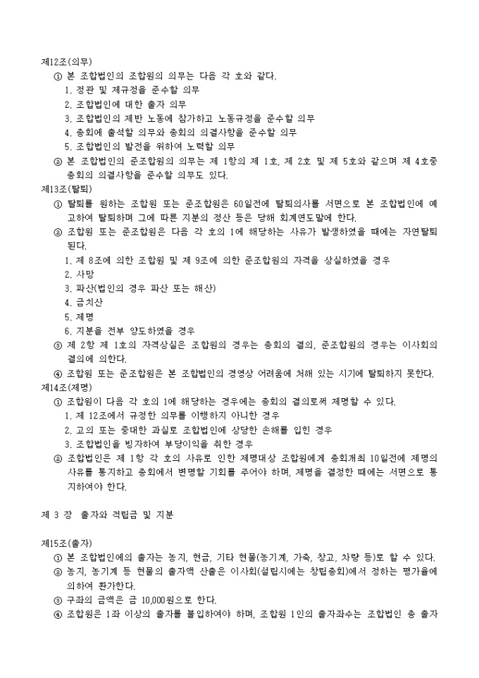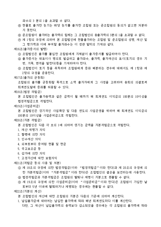9,000원/월아래의 항목으로 구성된 영농조합법인 정관입니다. 제 1 장 총 칙 제1조(명칭) 제2조(목적) 제3조(사무소의 소재지) 제4조(사업) 제5조(협동조합에의 가입) 제6조(공고방법) 제7조(규정의 제정) 제 2 장 조합원 및 준조합원 제8조(조합원의 자격) 제9조(준조합원의 자격) 제10조(가입) 제11조(권리) 제12조(의무) 제13조(탈퇴) 제14조(제명) 제 3 장 출자와 적립금 및 지분 제15조(출자) 제16조(출자증서의 발행) 제17조(출자의 균등화) 제18조(법정 적립금) 제19조(사업준비금) 제20조(자본 적립금) 제21조(적립금 등의 사용 및 처분) 제22조(지분의 계산) 제23조(지분의 상속) 제24조(조합법인의 지분취득 금지) 제25조(지분의 양도, 양수 및 공유금지) 제26조(탈퇴시의 지분 환불) 제27조(출자액의 일부환불) 제 4 장 회 계 제28조(회계연도) 제29조(자금관리) 제30조(경리공개) 제31조(사용료 및 수수료) 제32조(선급금제) 제33조(차입금) 제34조(수익분배 순위) 제35조(이익금 처분) 제36조(손실금의 처리) 제 5 장 임 원 제37조(임원) 제38조(임원의 선출) 제39조(이사회) 제40조(이사회의 기능) 제41조(이사회 의사록) 제42조(임원의 의무) 제43조(임원의 해임) 제44조(임원의 임기) 제45조(임원의 해임) 제46조(임원의 보수) 제47조(서류비치의 의무) 제 6 장 회의의 운영 제48조(총회) 제49조(총회의 소집) 제50조(총회의 의결) 제51조(총회의 개의와 의결정족수) 제52조(청산재산의 정리) 제 8 장 부 칙 제53조(준용규정) 제54조(최초의 영업연도) 제55조(현물출자의 내역) 제56조(시행일자)