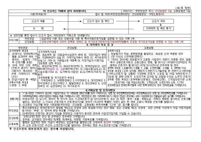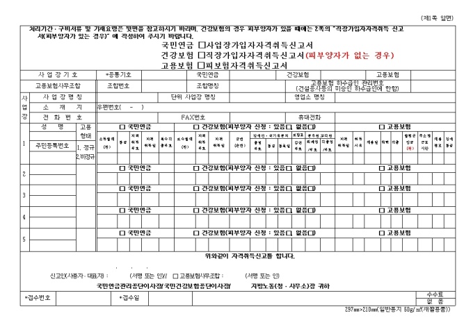 9,000원/월국민연금 사업장가입자자격취득신고서, 건강보험 직장가입자자격취득신고서(피부양자가 없는 경우), 고용보험 피보험자격취득신고서양식입니다.