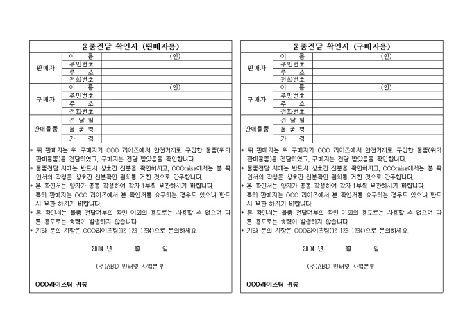 물품 구매자와 판매자간의 물품전달 내역을 확인할 때 사용하는 양식입니다. 판매자용과 구매자용 두자기 서식이존재합니다.