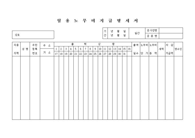 9,000원/월일용노무비지급명세서 양식입니다. 성명, 주민등록번호, 주소, 출력상황, 출역일수 등을 기재합니다.