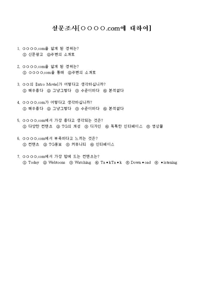 9,000원/월00.com에 대한 접근도, 이미지 등을 조사하는 설문지입니다. 총7가지 문항으로 이루어져있습니다.