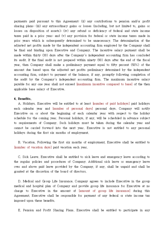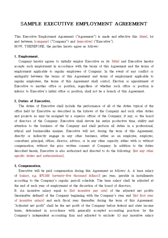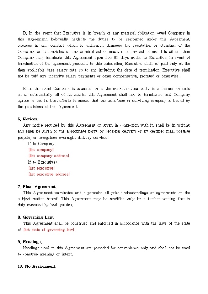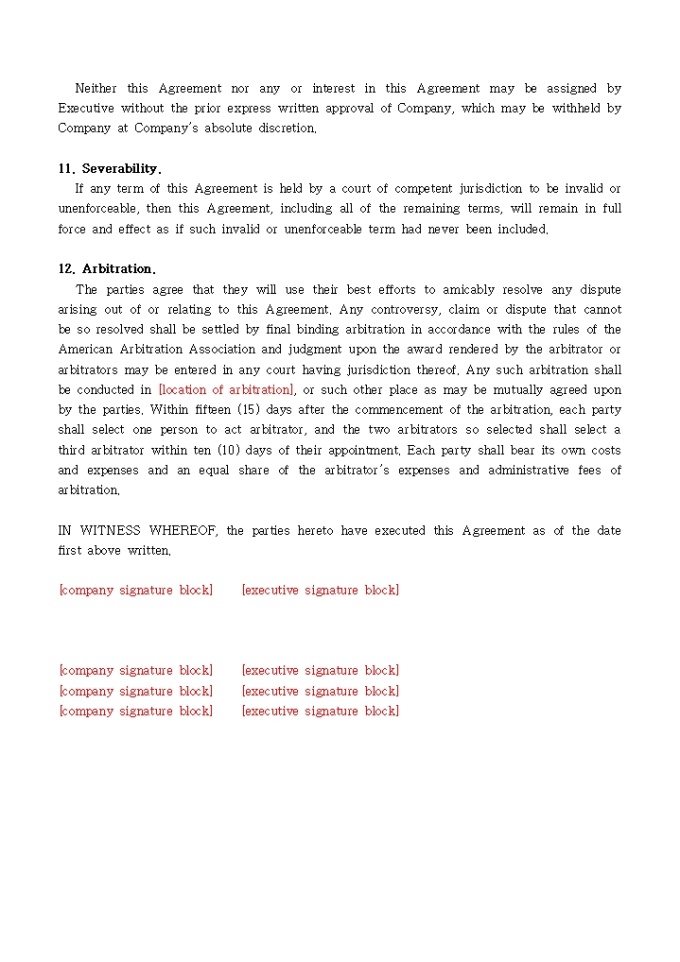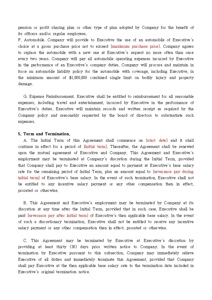 영문으로 작성된 간부원 고용 동의서입니다. 1. Employment 2. Duties of Executive 3. Compensation 4. Benefits 5. Term and Termination 6. Notices 7. Final greement...