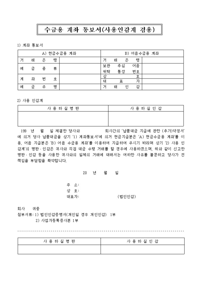 회사간 거래시 수금을 위한 계좌를 확인할 때 사용하는 양식으로 사용인감계 겸용입니다.