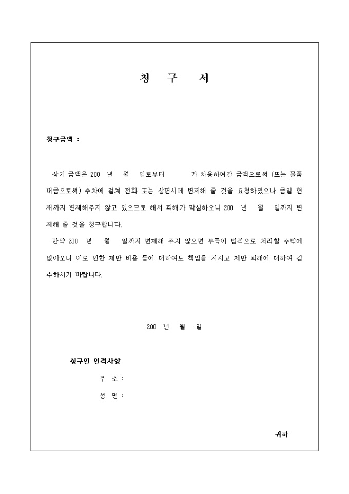 9,000원/월차용금액에 대한 변제를 요청하는 청구서양식입니다.