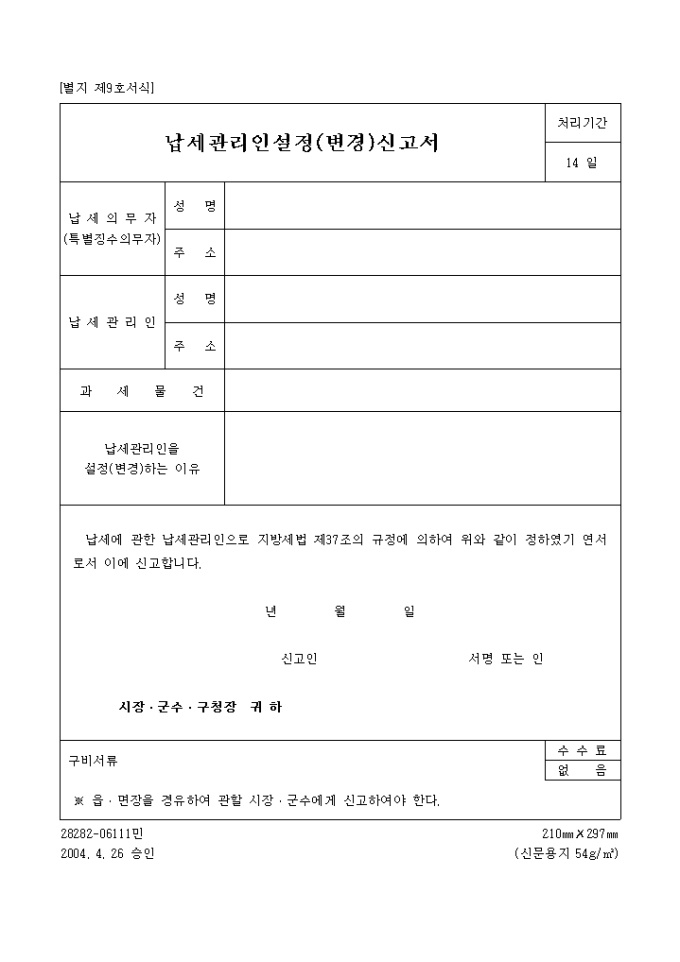 9,000원/월납세에 관한 납세관리인으로 지방세법 제37조의 규정에 의한 납세관리인설정(변경)신고서 양식입니다.