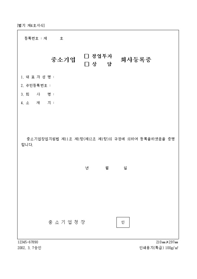 9,000원/월중소기업창업지원법 제11조 제1항(제12조 제1항)의 규정에 의하여 등록을하였음을 명하는 중소기업(창업투자)회사등록증 양식입니다.