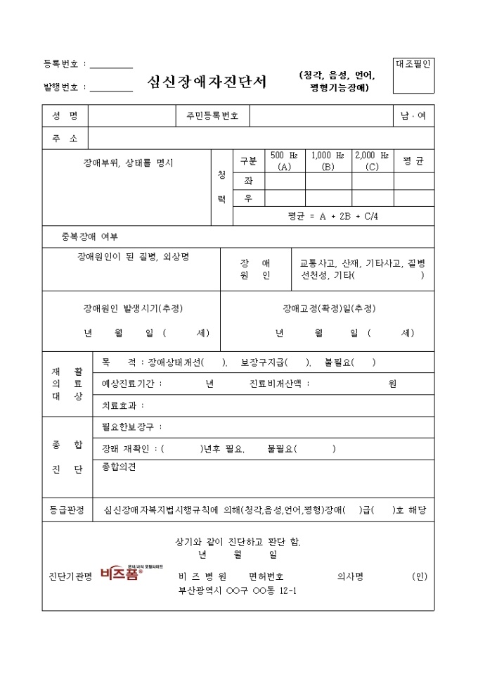 심신장애자복지법시행규칙에 의한 청각,음성,언어,평형 진단 양식입니다.