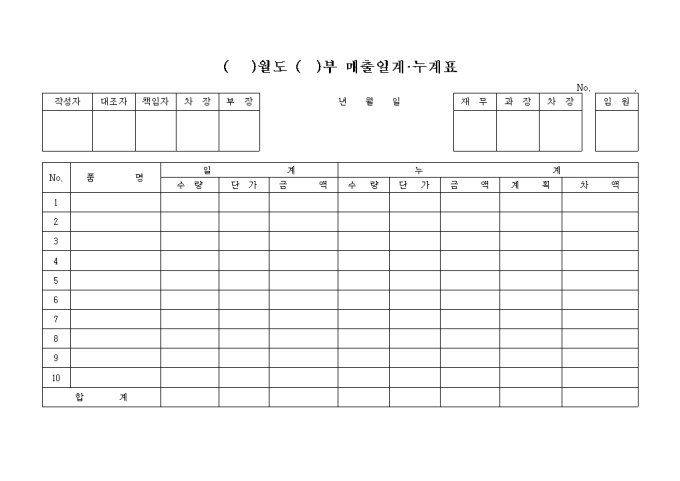 9,000원/월품목별 매출 수량, 단가, 금액등의 일계와 누계를 정리하도록 되어 있는 양식입니다.