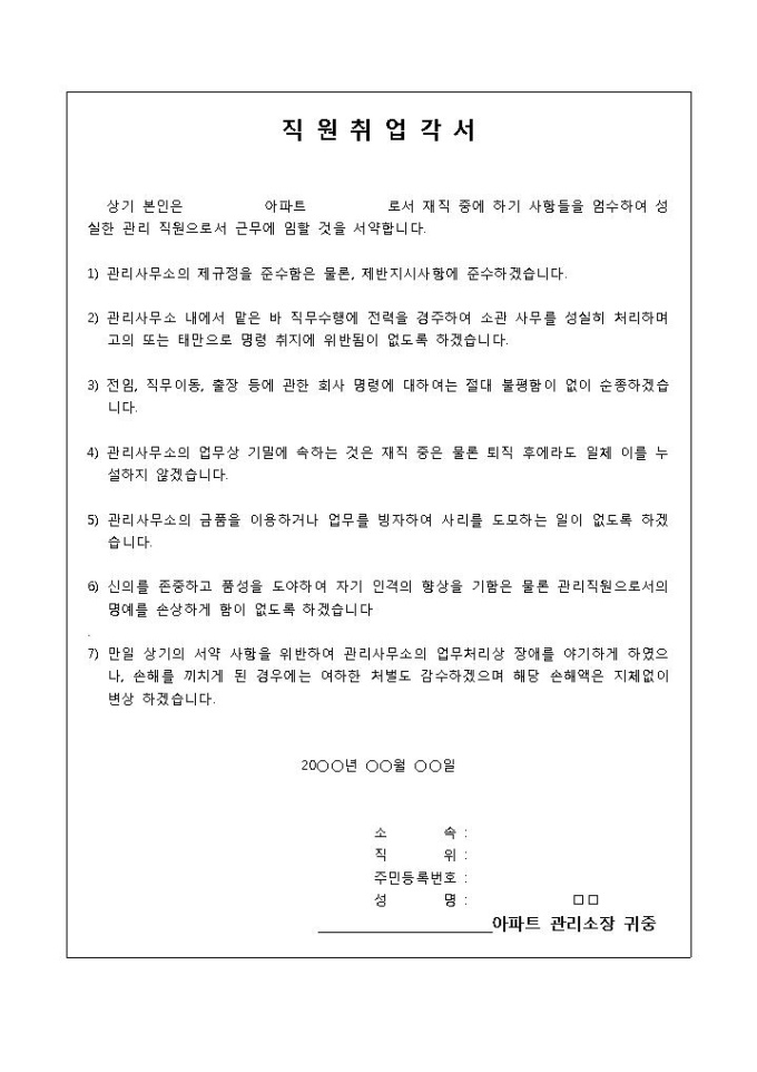 9,000원/월아파트 관리사무소 재직중에 하기 사항들을 엄수하여 성실한 관리 직원으로서 근무에 임할 것을 서약할 때 사용하는 양식입니다.