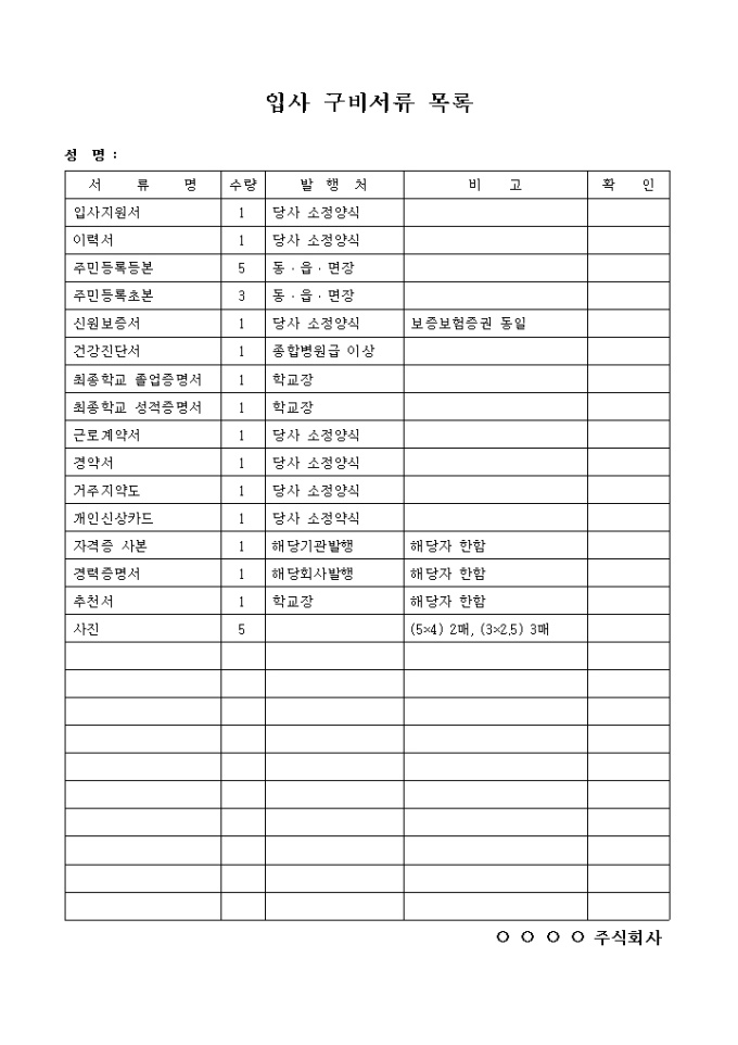 9,000원/월입사지원서, 이력서, 주민등록등본에서 ...자격증사본, 추천서등 입사시 구비해야 할 서류들의 목록이 기재된 양식입니다.