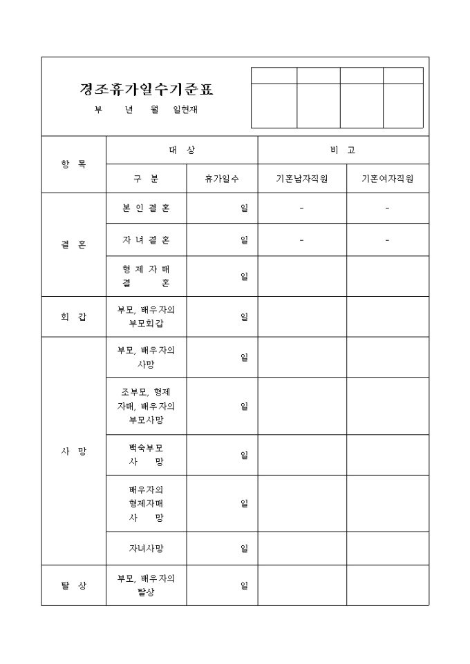9,000원/월각종 경조사에 대해 휴가 일수를 기재하는 양식입니다.