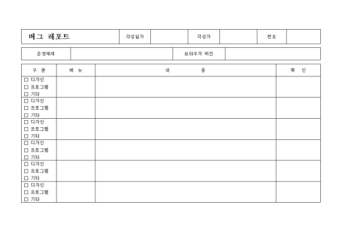 9,000원/월디자인, 프로그램, 기타별 버그 내용을 기록할 수 있는 양식입니다.