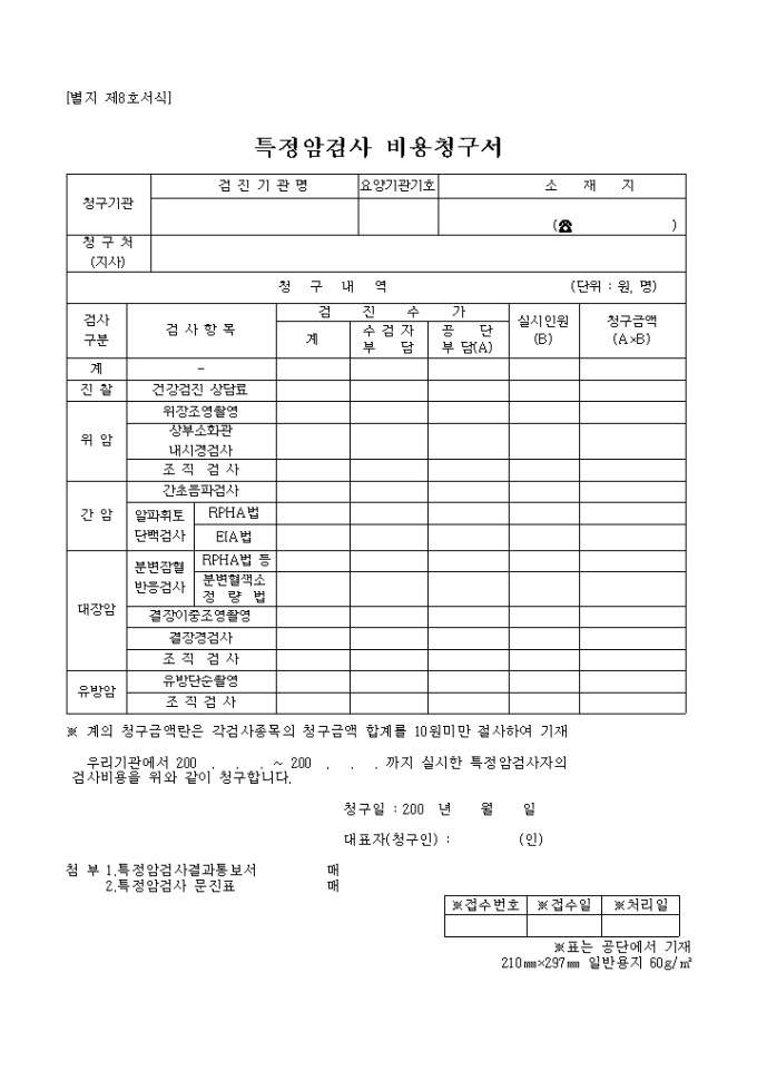 9,000원/월청구기관, 청구처, 청구내역등의 항목을 기재하여 특정암검사 비용을 청구할 때 사용하는 양식입니다.