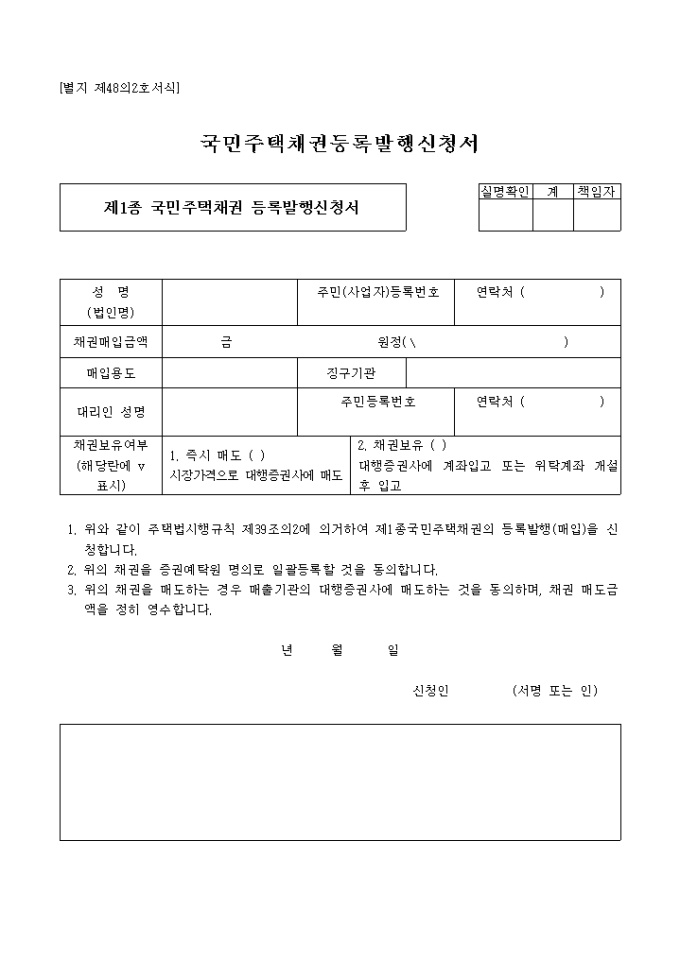 9,000원/월국민 주택 채권 등록 발행 신청서 양식입니다. 성명, 채권매입금액, 매입용도, 대리인 성명, 채권보유여부 등을 기재합니다.
