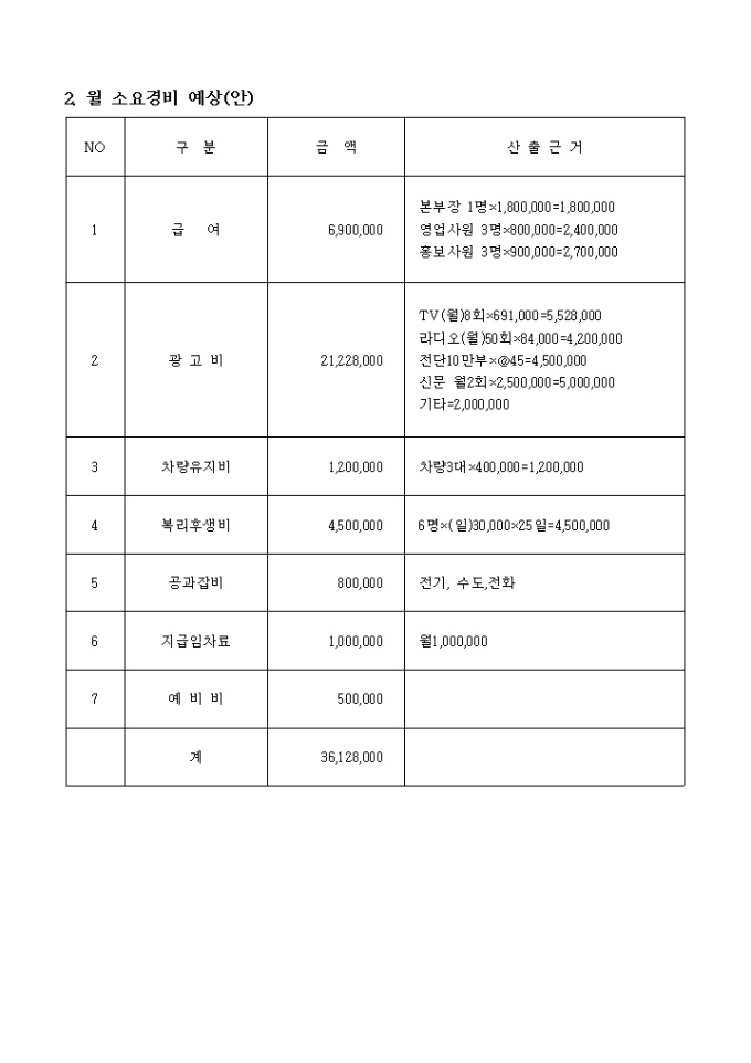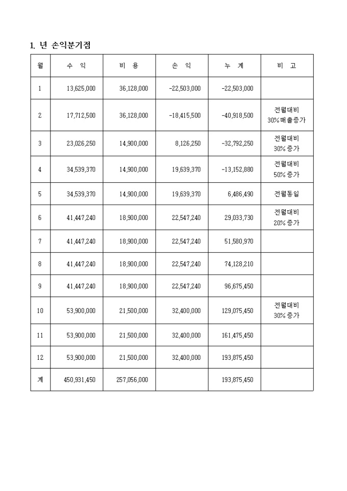 9,000원/월1. 년 손익분기점 2. 월 소요경비 예상(안) 3. 월 매출 및 수익예상(안) 손익계산안 (년 손익분기점) 양식입니다.