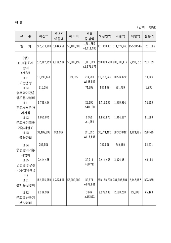 9,000원/월과목별 예산액, 징수결정액, 수납액, 미수납액, 증감율을 기술해 놓은 [문화]문화재청 소관 세입세출 결산 개요 양식입니다.