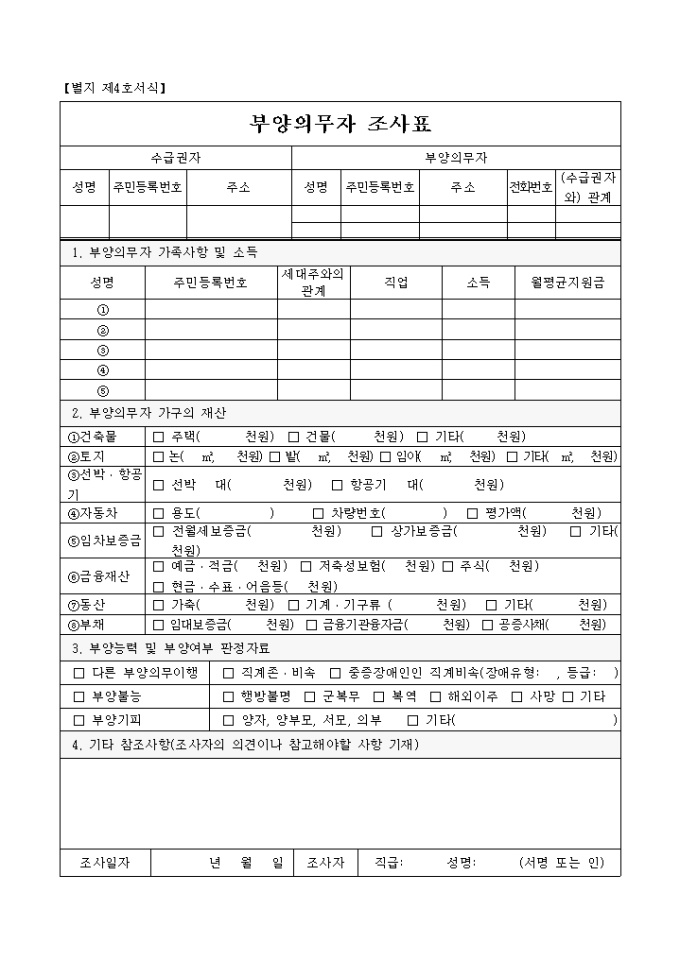 9,000원/월1. 부양의무자 가족사항 및 소득 2. 부양의무자 가구의 재산 3. 부양능력 및 부양여부 판정자료 4. 기타 참조사항(조사자의 의견이나 참고해야할 사항 기재) [보건]부양의무자 조사표 양식입니다.