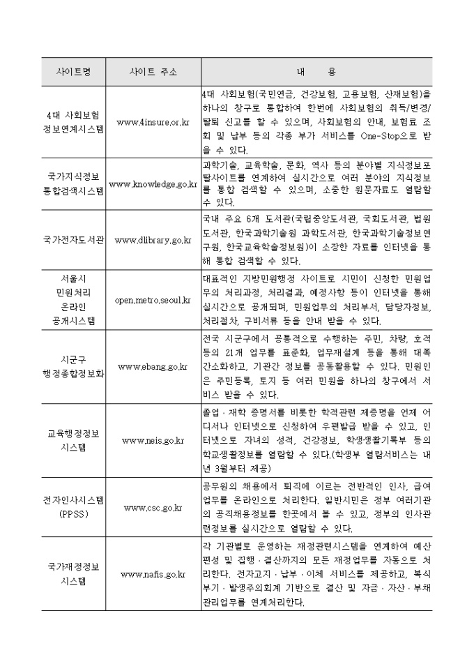 9,000원/월사이트별 주소 및 내용을 소개해 놓은 [특허]전자정부 주요 시스템 소개 양식입니다.